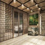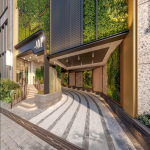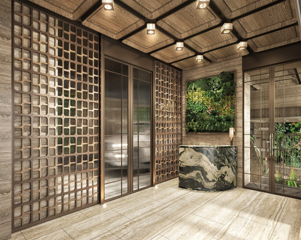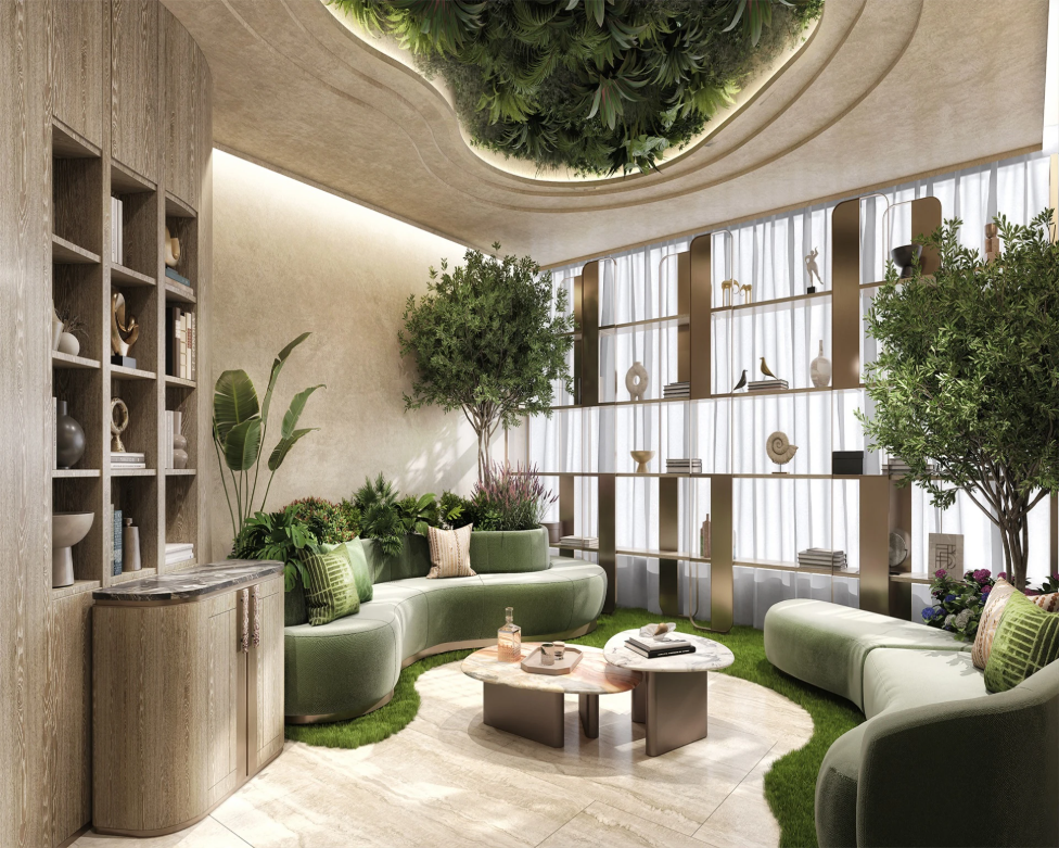 建築師巧妙運用蒼翠綠植、碳灰及金色金屬飾面,